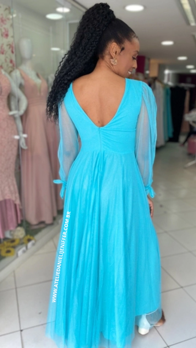 Vestido longo com manga longa, todo brilhoso, esse modelo possui um decote em V, suas mangas são em tule que trazem uma leveza especial a peça.