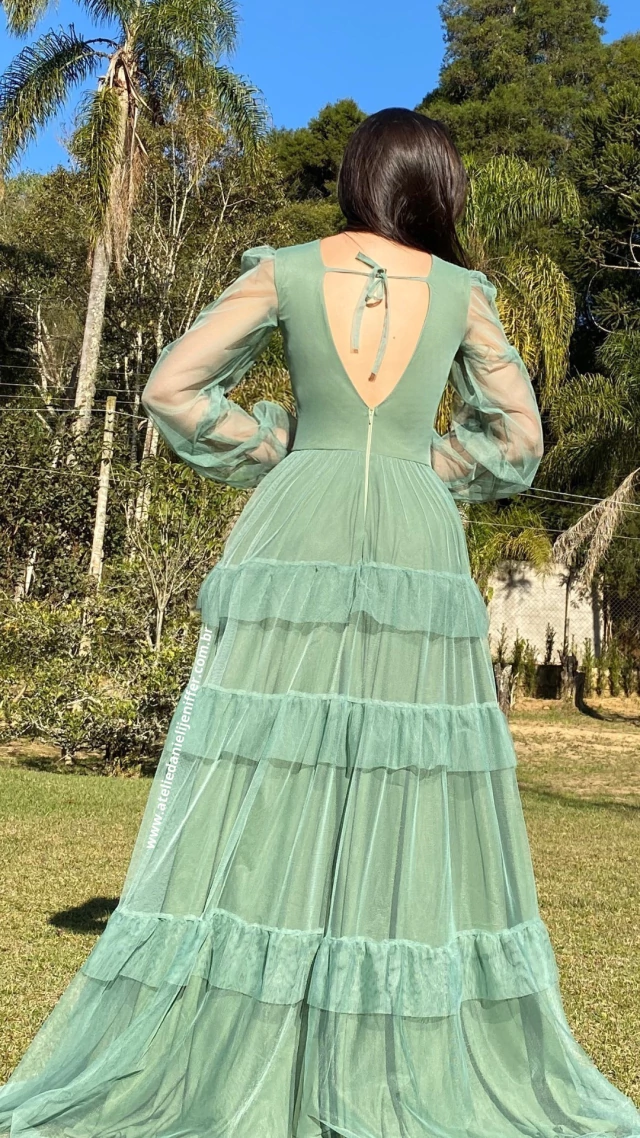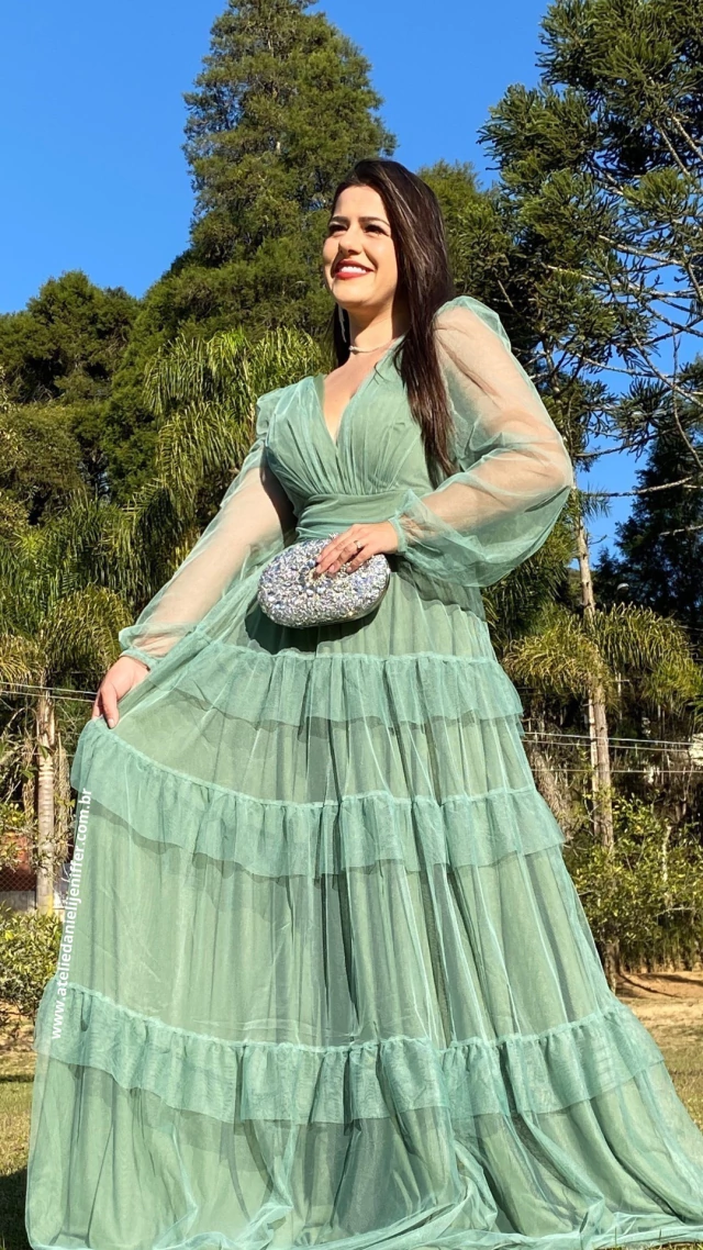 Vestido longo, com decote delicado, mangas longa e saia com babado três maria trazem leveza a peça.